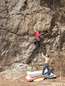 Včera jsme s Káťou opět vyrazili na Bor, ale bohužel bylo plno věcí mokrých od tajícího sněhu nebo od včerejšího deště. Něco málo jsme ale přece jen ulovili :) Kátě se podařilo hezky přelézt dvě 4ky u Křováků a daleko ani nebyla k 5A na kameni Sedmiboj. Zapomněla si lezačky, ale Auxi jsou prý moc fajn!